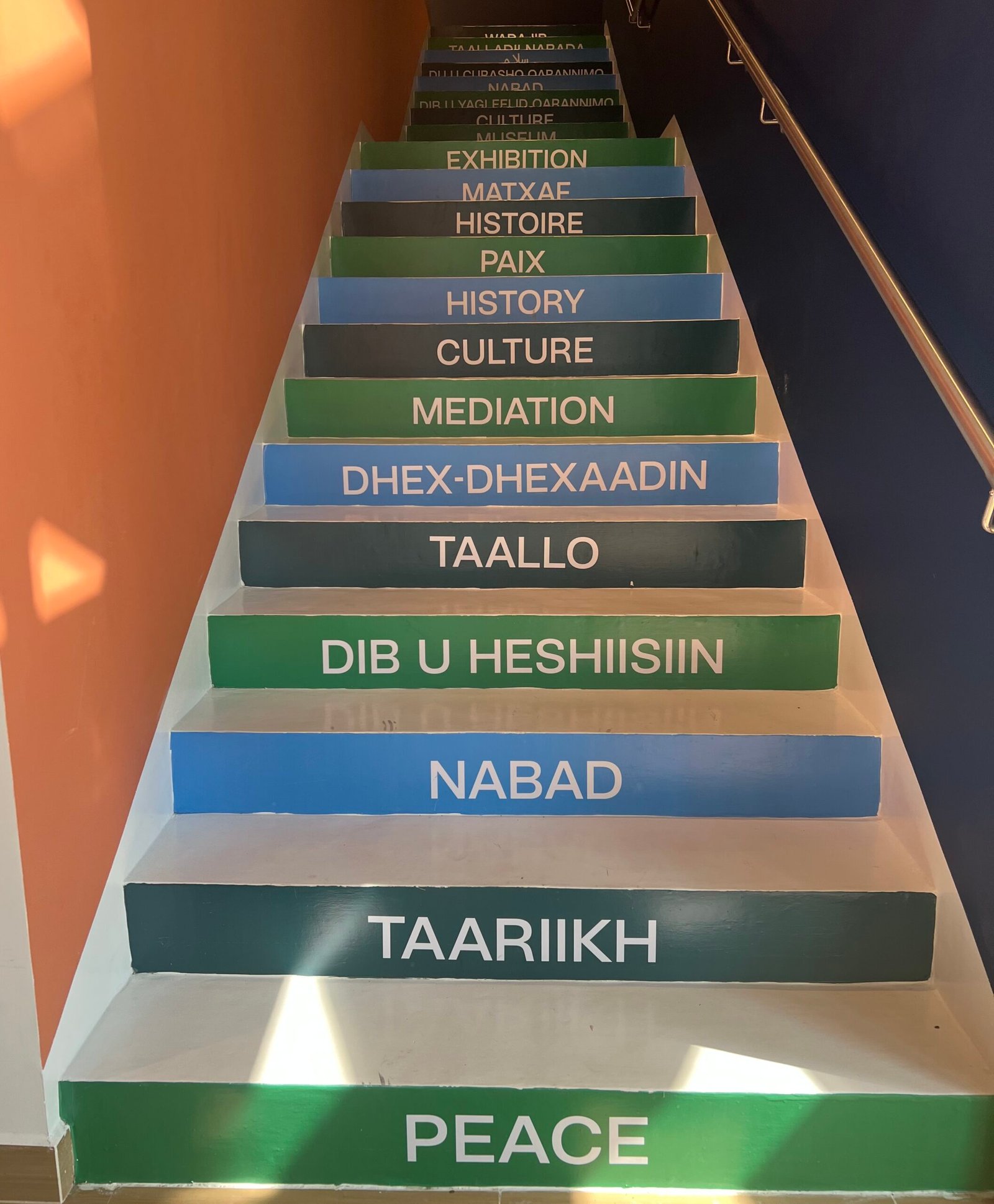 When the speeches concluded, I had the opportunity to tour the Arta Peace Memorial. There were books, pictures, names, and registration forms of people who attended the conference. On the walls, there were slogans, information about the conference, and news reported about the event. The slogans on the walls included: “Dugsi maleh qabyaaladi waxay dumiso mooyaane” by Abdullahi Suldan Timacadde and “Noloshu Waa Nabad, Sharaftuna Waa Qaran.” There were screens that played conference speeches and pictures of Somali trees. The stairs at the Peace Memorial had names written on them including peace, mediation, culture, history, museum, and exhibition.